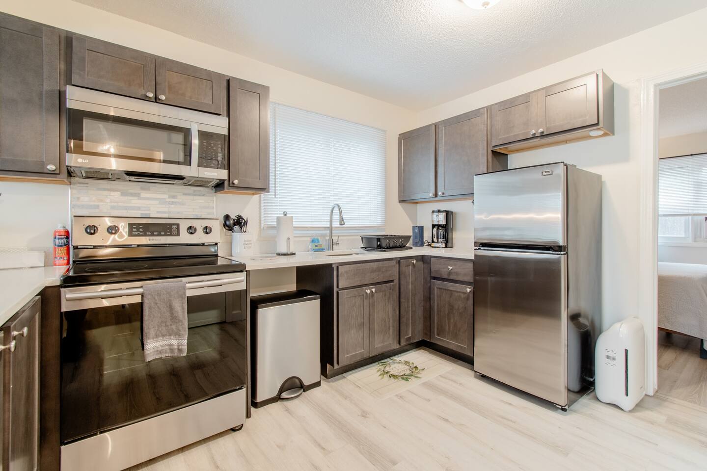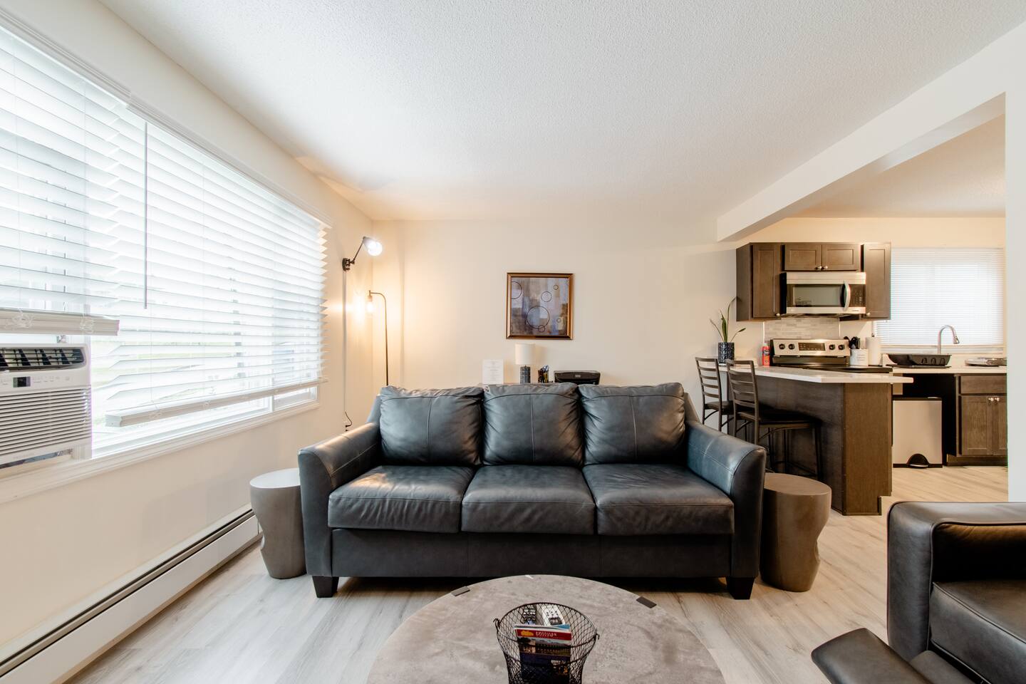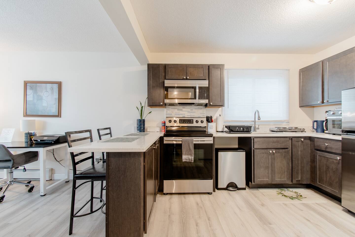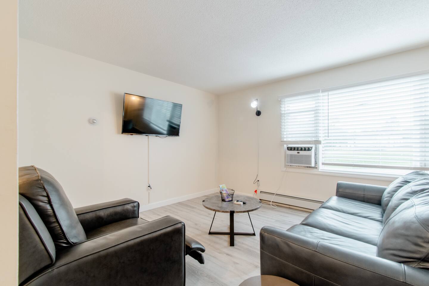 ๐ข 4 attractive and invitingly spacious 1-bedroom apartment suites in a quiet building (2 per floor) fully equipped with bed, bath, kitchen and office essentials. ๐ณ Kitchen with essentials for preparing a family meal size, large and small appliances including stove, refrigerator, toaster, coffee maker, mini blender, and electric kettle. ๐๏ธ Each unit includes a queen bed, bath/shower combo, kitchen & office essentials. ๐ Full bath with shower-soaker tub & great water pressure. ๐ผ Workspace with color printer, 43-50" Roku TV and fast Wi-Fi. ๐๏ธ Fold-up twin bed(s) based on availability, fees may apply. ๐งบ Shared low traffic 24/7 laundry & ๐ ฟ๏ธ designated parking. All else is private. ๐ Book multiple suites or the entire building when all units are available! ๐ซ No pets or animal(s) allowed โ strict policy for everyone's safety. โ ๏ธ Non-compliance fee applies per house rules.