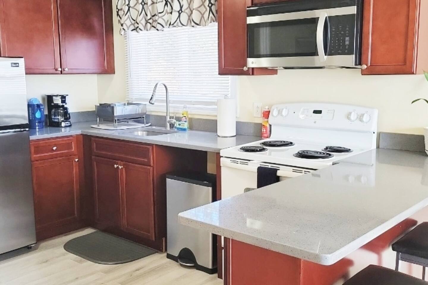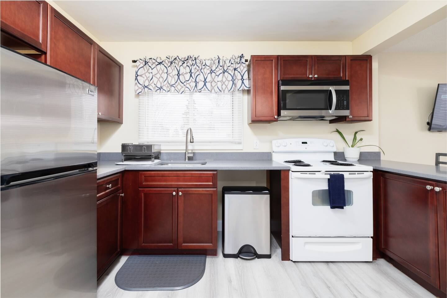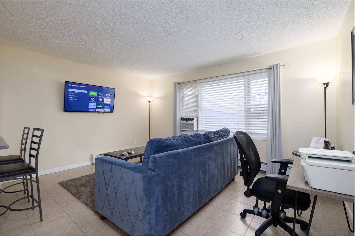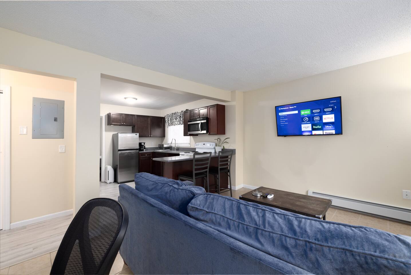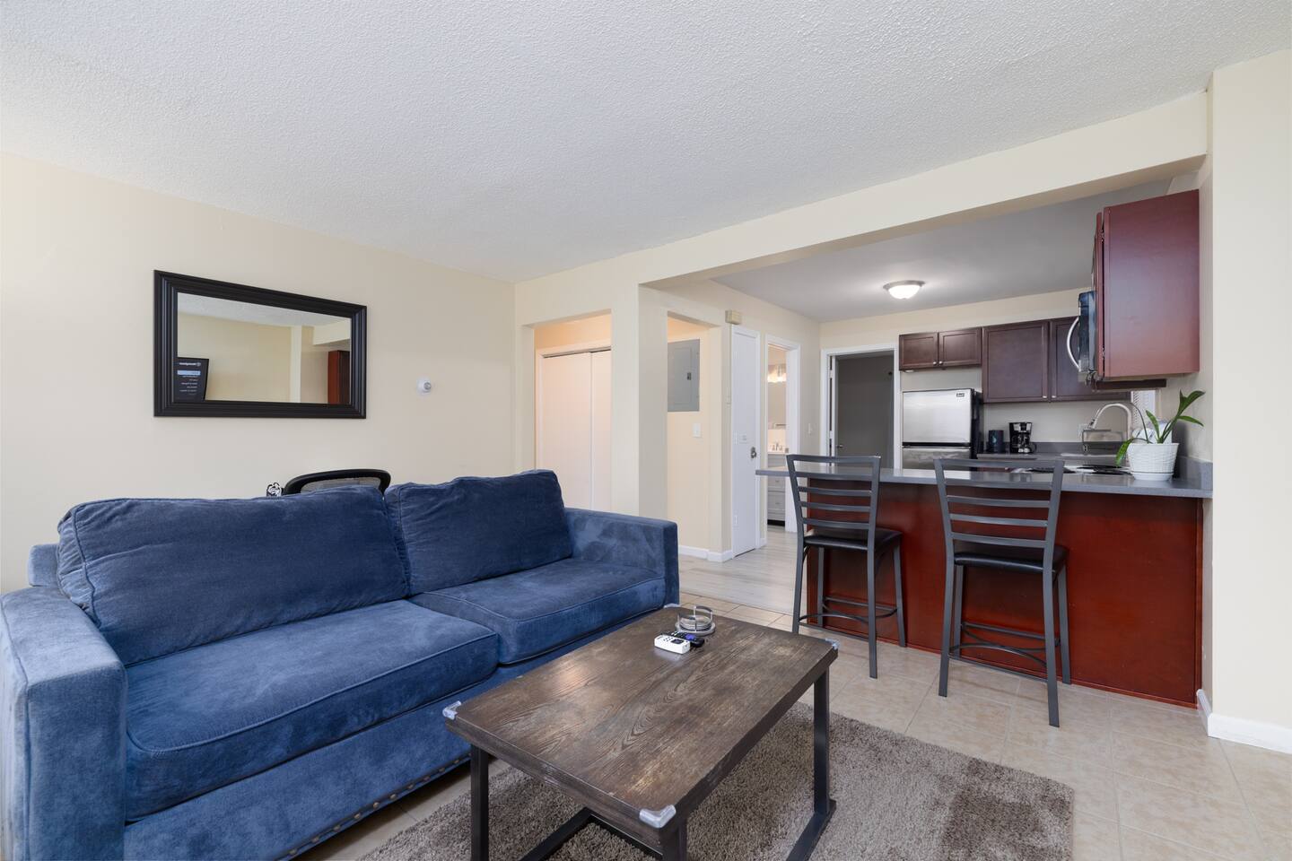 🌟 Whether you're here to explore, relax, or work remotely, our suite offers the comfort, convenience, and cleanliness you deserve. ✨ Your Perfect Home Away From Home Awaits! ✨ Step into comfort and style in this spacious one-bedroom suite—thoughtfully designed ideal for a small family, a couple or solo travelers seeking both relaxation and productivity. 🛏️ Spacious bedroom featuring a cozy queen-sized bed, double closets, and blackout curtains for restful nights. Xtra twin rollaway upon availability (not a blow up bed) Move sofa cushions and it's the most comfortable rest for up to two adults. 🛁 Refresh and recharge in the luxurious bathroom with a shower-soaker tub combo, amazing water pressure, and complimentary toiletries—plus fresh towels and bed linen upon arrival. 🍳 Cook with ease in the fully equipped open kitchen stocked with essential cookware and modern appliances. 💼 Need to work? Enjoy a dedicated workspace, fast Wi-Fi ⚡, and a 50” Roku Smart TV for your wind-down moments. 🛋️ Ask us about extra bedding options, including a twin fold up bed—perfect for an additional guest or extra comfort. 🌟 Our meticulously maintained building ensures a peaceful and private stay, ideal for business travelers, remote workers, or anyone seeking a relaxing getaway. 💫 Whether you're here for business or pleasure, you'll feel right at home in our clean, cozy, and welcoming space. 🧼 Sparkling clean, thoughtfully designed, and ready to welcome you— 📅 Book now and treat yourself to a truly delightful stay! 🏡✨ 🍳 Cook with ease in the fully equipped kitchen, complete with essential cookware and modern appliances. 📺 Unwind with a 43” Roku Smart TV, get work done at the dedicated desk, and stay connected with fast Wi-Fi. 🚗 Free off-street parking is available on-site—no need to stress about finding a spot after a long day. 🧺 On-site coin laundry is available in the West Laundry Room, shared among a maximum of three other guests. With low building traffic, you’ll likely have the space to yourself.