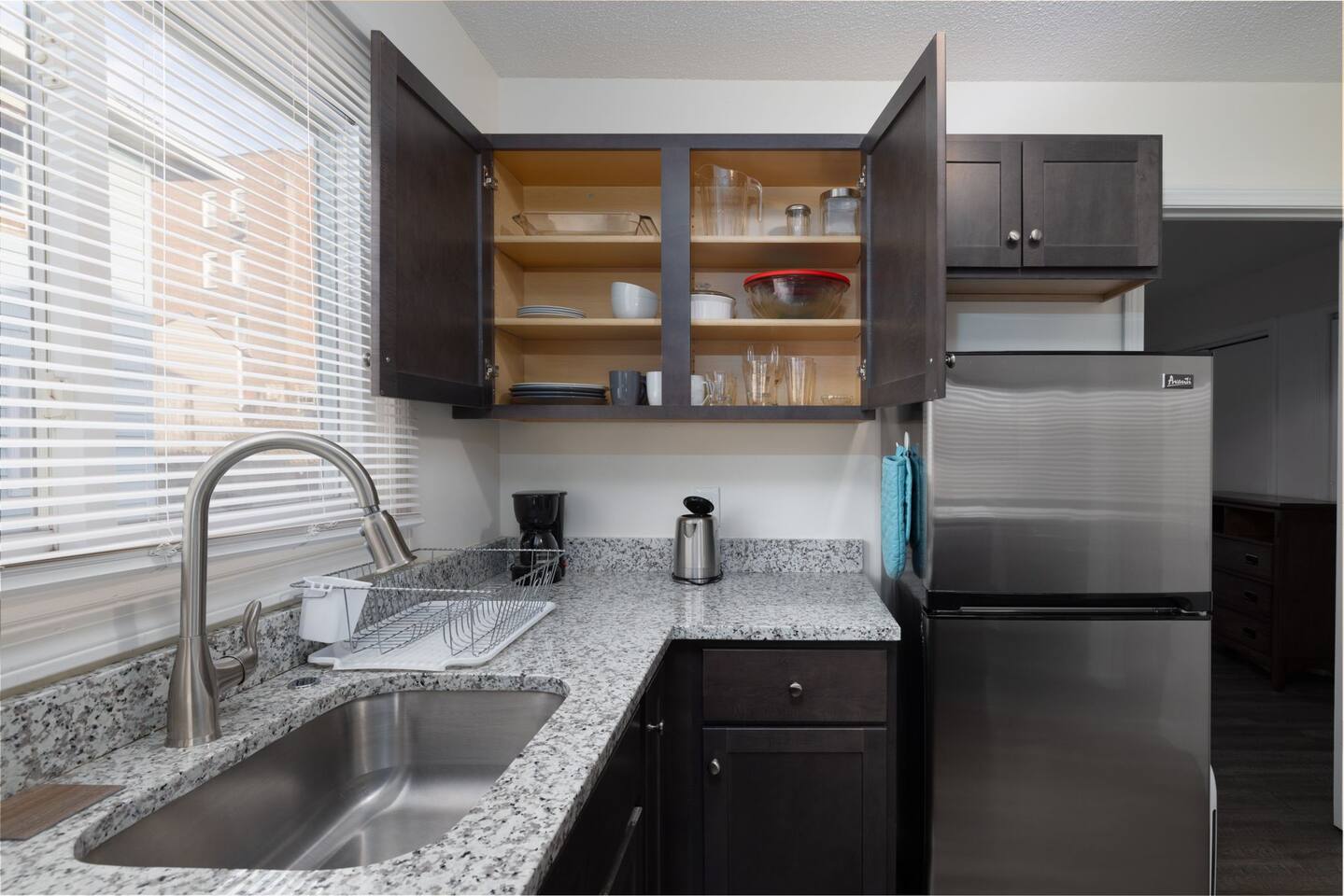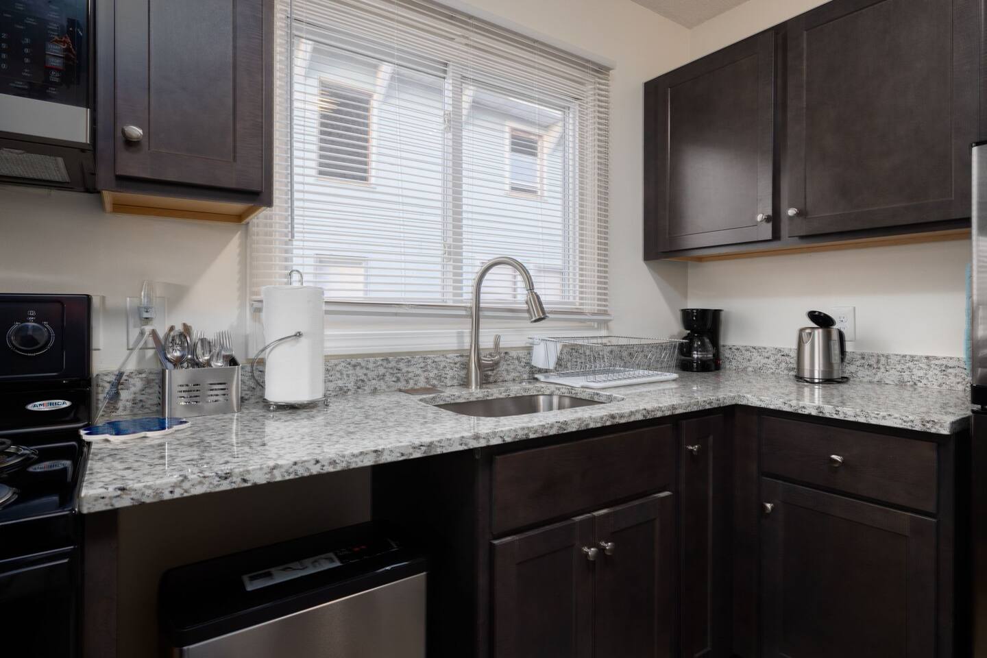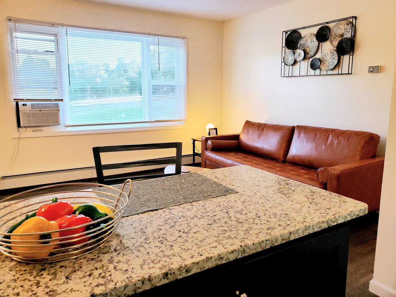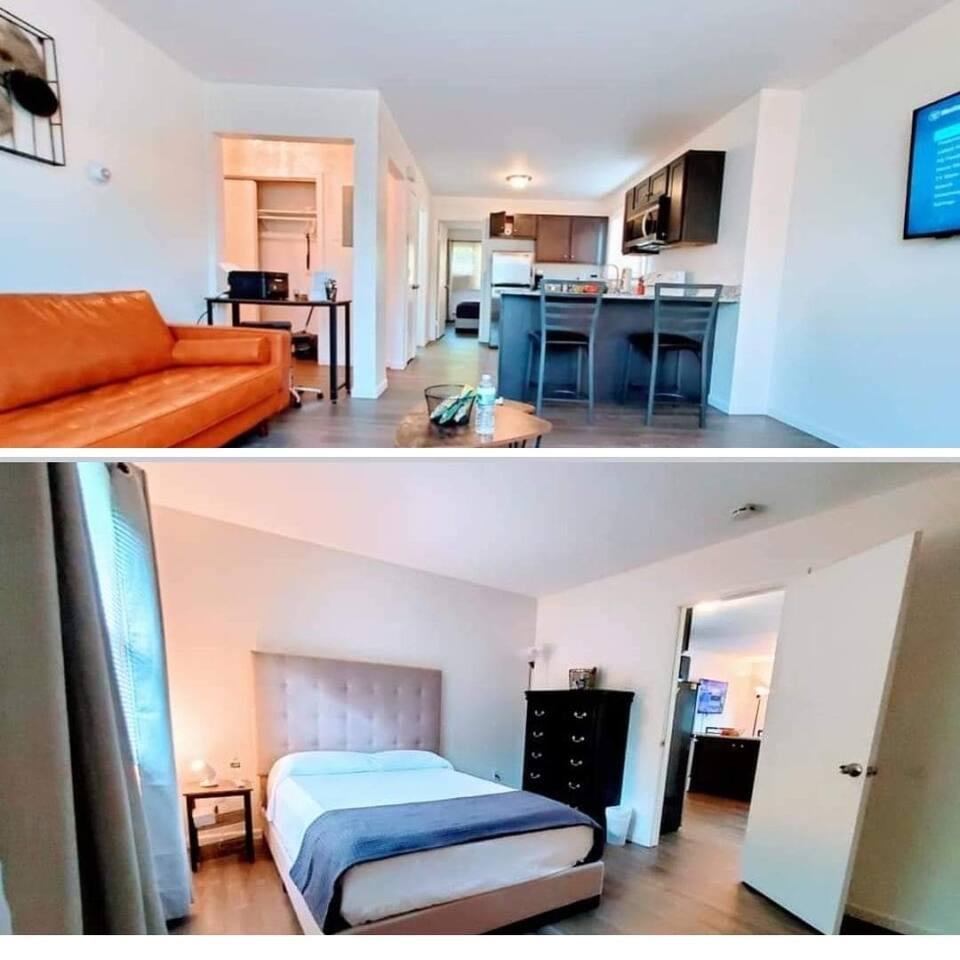Each unit, almost identical in size and layout has a queen bed, bedroom with double closets, living room, full bathroom, full kitchen and picture windows. There's also a desk and printer in each with bed, bath and office essentials for your convenience. Housekeeping services can be arranged at an additional cost or complimentary for some lengthy stays (for common areas with focus on bathroom and kitchen.) Garages are located directly below the building with parking directly in front of the garage. Some bookings may have access to three one-car garages, however uncovered parking for 4-5 vehicles are guaranteed no matter the booking cost/length of stay.
