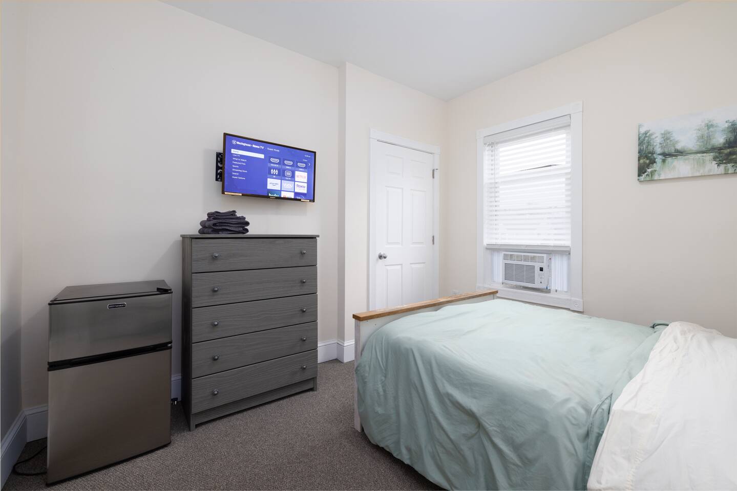 This private townhouse features a first and second floor, with one bedroom on the main floor and four additional bedrooms above. There are at least 2 queen beds and 3 full-sized beds available primarily in additional to a fold up twin. For smaller groups of 6 or fewer, unused rooms may be locked off unless you need it. Additional bedding is available upon request. The space comfortably sleeps up to 10, with exceptions made for larger groups with additional foldout twin beds upon request/availability and/or the use of the 3rd floor unit that has an additional queen bed and 2 full beds, a completely private 3rd floor unit that can be adjoined to create an 8-bedroom 3 bath retreat for a total of a 3 level entire building townhouse living. This booking on its own, however is a two level 5-bedroom, 2-bath townhome. Parking is shared with the 3rd floor unit when it is occupied, however your unit has priority parking privilege.